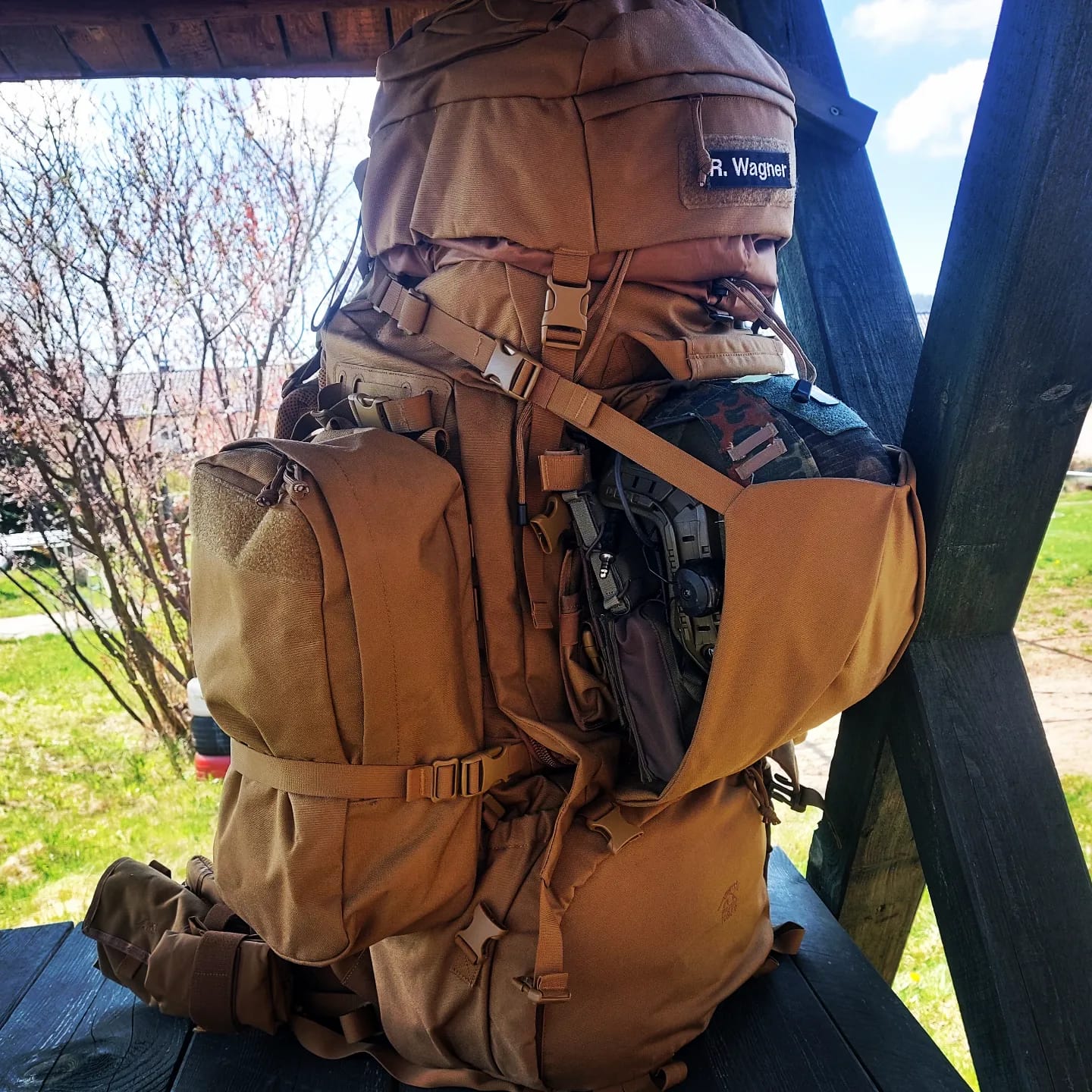Mil OPS Pack 80+24 jeder kennt die Klassiker von Tasmanien Tiger, den Range Pack, MKII, den Patfinder MKII und das Field Pack MKII und die kleineren „Brüder“ wie den Modular Trooper Pack und den von mir selbst im Einsatz getragenen der Raid Pack MKII. Ein dankbarer, durchdachter und ausgereifter Rucksack, mit jeder Menge Einstell- und Konfigurationsmöglichkeiten, egal ob im dienstlichen oder privaten Gebrauch. Bis dato war mein Raid Pack MKII in Coyote braun (mit 5 Farben Tarndruck BW Silikon Regen Cover) ein zuverlässiger Begleiter bei täglichen Einsätzen, aber auch bis 7 Tages Unternehmungen. Daher fiel es für mich erst einmal schwer, sich auf etwas Neues und schon im Vorfeld hoch angepriesenen und noch nicht offiziell erwerbbaren Mil Ops Pack 80+24 einzulassen. Da ich kein euphorischer Mensch bin und grundsätzlich jeglichen Produkten skeptisch gegenüberstehe, muss man mich bzw. ich mich persönlich davon schon überzeugen. Eine Woche bevor es öffentlich kundwurde, dass der Mil Ops Pack 80+24 das Beschaffungsverfahren in die Bundeswehr geschafft hat und für den zivilen Markt in olivgrün und coyote brown zur Auslieferung an uns Händler steht, orderte ich bei Tasmanien Tiger das Objekt der Begierde an, mit der Bitte, es noch in dieser Woche, diesen im Versand zu geben, damit er mir am Sonntag zu einer DVAG der HSchKp SN, auf den Truppenübungsplatz Oberlausitz zur Verfügung stünde. Meine Gebete wurden erhört und Freitag erfolgte die Anlieferung. Ein Danke noch mal an Lisa von Tatonka/Tasmanien Tiger. Nun stand er vor mir, nackig, ohne Seitentaschen und Pouches. Ich holte mein Raid Bag MKII, setzte ihn daneben und pouchte die noch am Beckengurt befindlichen Pouches ab, um diese dann an meinen neuen Mil-Ops-Pack zu befestigen. Weiterhin befestigte ich die dazu gehörenden großen 12 Liter Inhalt fassenden Seitentaschen, welche sich im Hauptfach des Mil-Ops-Pack befanden an den Seiten. So im direkten Vergleich, der beiden Rucksäcke nebeneinander, lässt sich schon der Mehrgewinn an Platz erahnen. Da der Mil-Ops-Pack größer bzw. höher oder länger als der Raid Bag MKII ist, ergeben sich ganz andere Gewichts- und am Körper anliegende Druckverhältnisse. Das größenverstellbare V2-System leistet hier wie schon bei dem Raid Bag MKII ganze Arbeit. Daher bin ich auch bewusst bei diesem V2-Tragesystem geblieben, weil ich es kannte und immer damit zufrieden war. Ich kann ganz individuell die Tragehöhe, den Überhang oben wie unten zum Körper einstellen und somit für ein bequemes Tragekomfort sorgen. Es gibt auch keine Musterlösung der Einstellungen für alle und jeden. Jeder Träger hat seine eigene Rückenform und Länge. Die Form der Lendenwirbelsäule, bzw. dessen Lordose (Vorwölbung, auch Hohlkreuz genannt) ist Ausschlag gebend bei der Einstellung der Höhe. Ist diese gut ausgeprägt, sitzt der Rucksack mit seinem Gewicht und Beckengurt auf den Beckenschaufeln auf. Dies entlastet den Druck der Träger auf den Schultern. In hügeligen und alpinen Gelände, kann das wiederum zur Bewegungseinschränkung bzw. Ermüdung des großen Gesäßmuskels kommen, welcher mit den vorderen Oberschenkel die meiste Arbeit beim Laufen aufbringen muss. Ihr seht, das ist fast schon eine Wissenschaft mit der optimalen Einstellerei. Aber seit beruhigt, der Rucksack und Euer Körper wird beim ersten Marsch schon zeigen, wo „es drückt“ und nachgebessert werden muss. Dank V2-System ist dies kinderleicht und beinhaltet für jeden die richtige und individuelle Lösung. Der weiche sehr gut aufgepolsterte Beckengurt, sorgt für eine angenehme Spannung und Tragekomfort rund um das Becken. Doch zum Beckengut komm ich später noch einmal. Das nächste Feintuning, nach den V2-System Raster, ist die Einstellung der Schultergurte, bzw. dessen Länge. Hier kann ich auch noch den Druck auf mein Becken, über den Beckengurt variieren. Im Stand ist das alles leicht und schnell gemacht, jedoch in der Praxis bei einer Tour, kann eine falsche Einstellung zur Tortour werden. Was natürlich richtig gut ist, ist dass der Rucksack von oben unter dem Deckel und von hinten zu öffnen geht. Oben noch mit einen Windstopper versehen, bietet dieser Schutz vor Nässe, selbst wenn der Wind und Regen auch von der Seite kommt, bleibt das darin befindliche Equipment sauber und trocken. Der Deckelrand ist ebenfalls hoch genug, um den Rucksack rundum abzudichten. Selbst diesen Windstopper kann man mit zusätzlichen Equipment nach obenhin befüllen. Der in der Höhe verstellbare Deckel ermöglicht mehr Inhalt und sorgt auch für dessen festen Sitz. Es wackelt und schwingt nichts unkontrolliert umher. Im Deckel befindet sich noch ein weiteres Fach, so groß wie der Deckel und ist gut und schnell zu erreichen und zu öffnen. Erste Hilfe Equipment oder eine größere Optik wie DF, Luci oder Big passen sehr gut hinein.